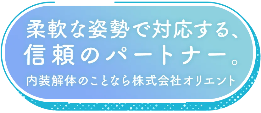 東京都板橋区を拠点に、都内および埼玉県・神奈川県・千葉県で内装解体をメインに手がけている株式会社オリエント。弊社は「無事故」をモットーとしています。ご依頼をくださったお客さまはもちろん、近隣にもご迷惑をおかけしないよう、工事による影響を最小限に抑える工夫を行なっています。